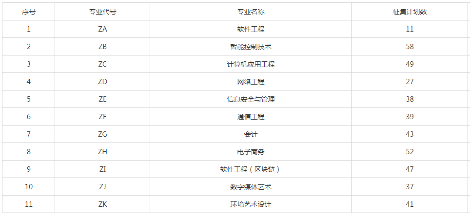 发布时间:2020-08-31 浏览次数:1652序号缺额专业缺额人数1软件工程112智能控制技术583计算机应用工程494网络工程275信息安全与管理386通信工程397会计438电子商务529数字媒体 -